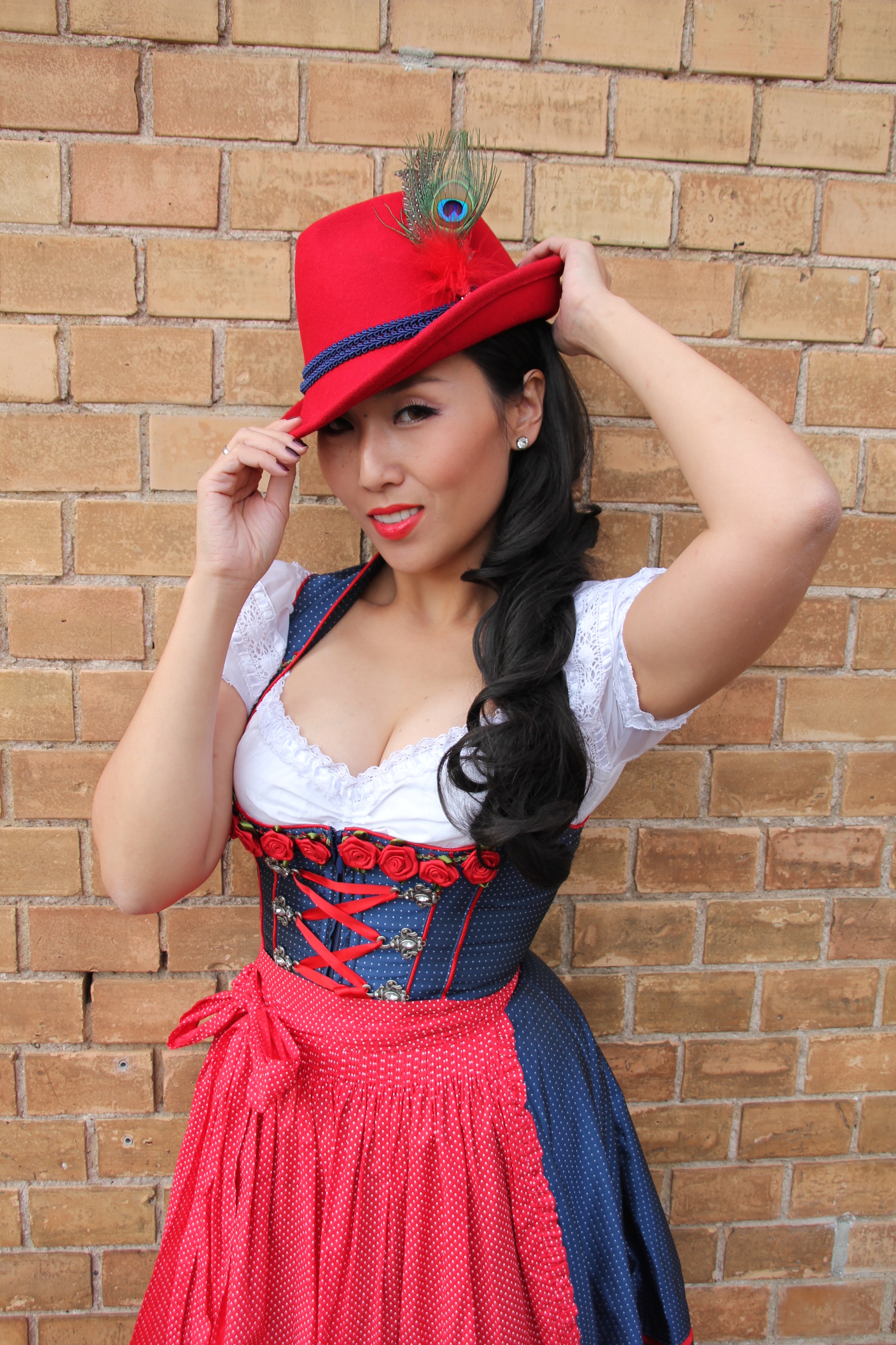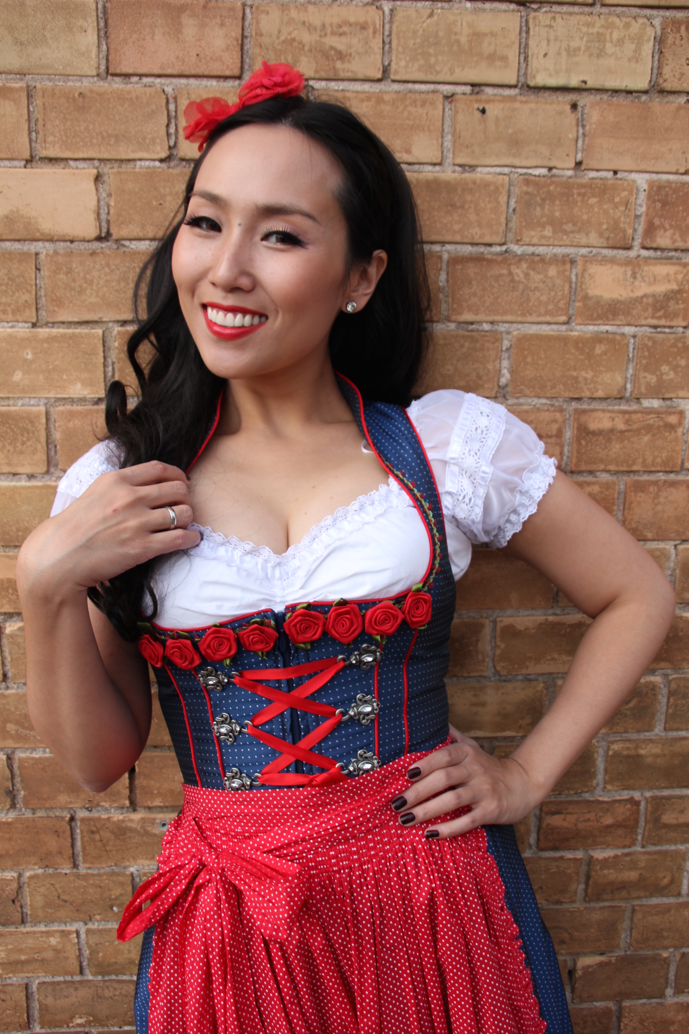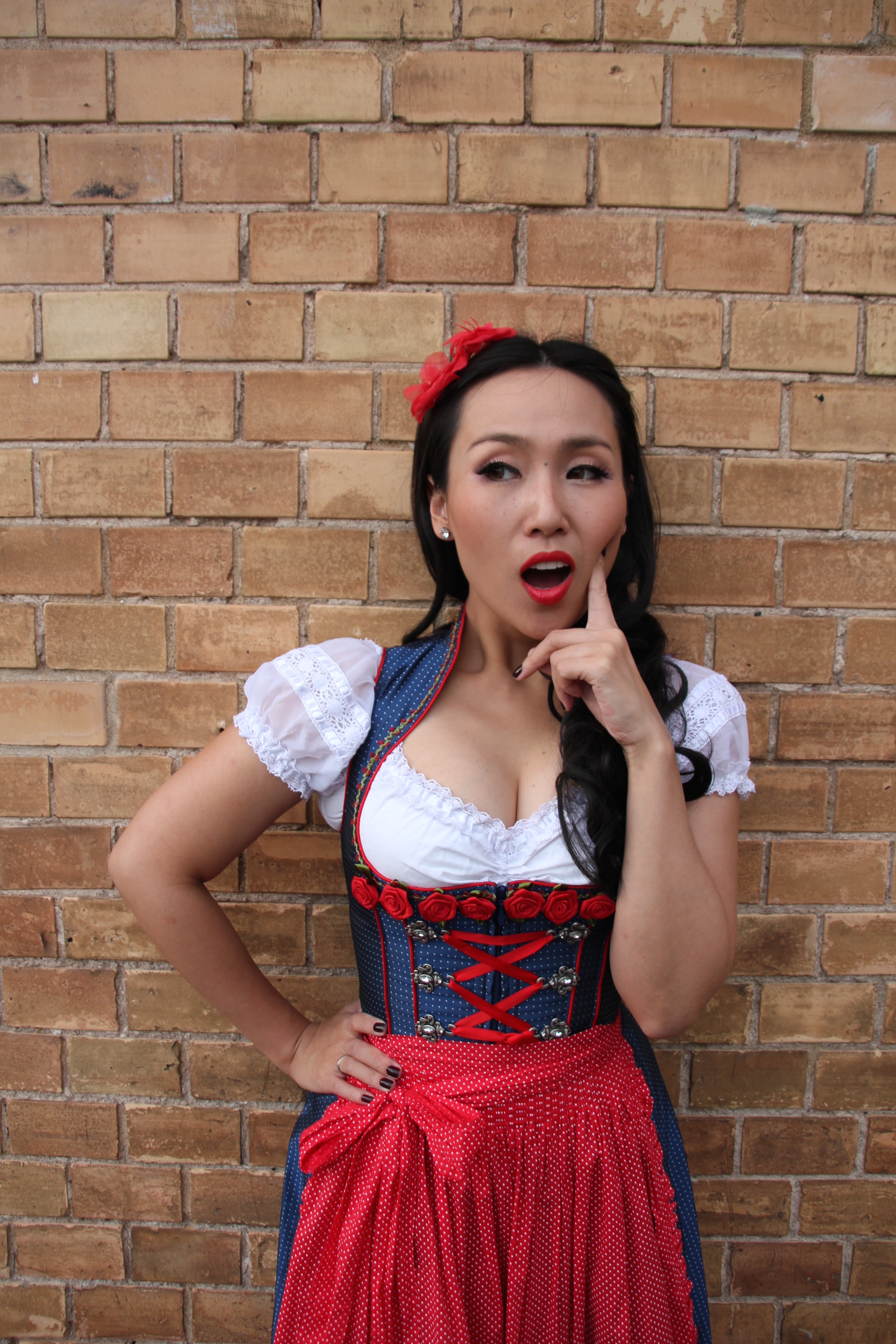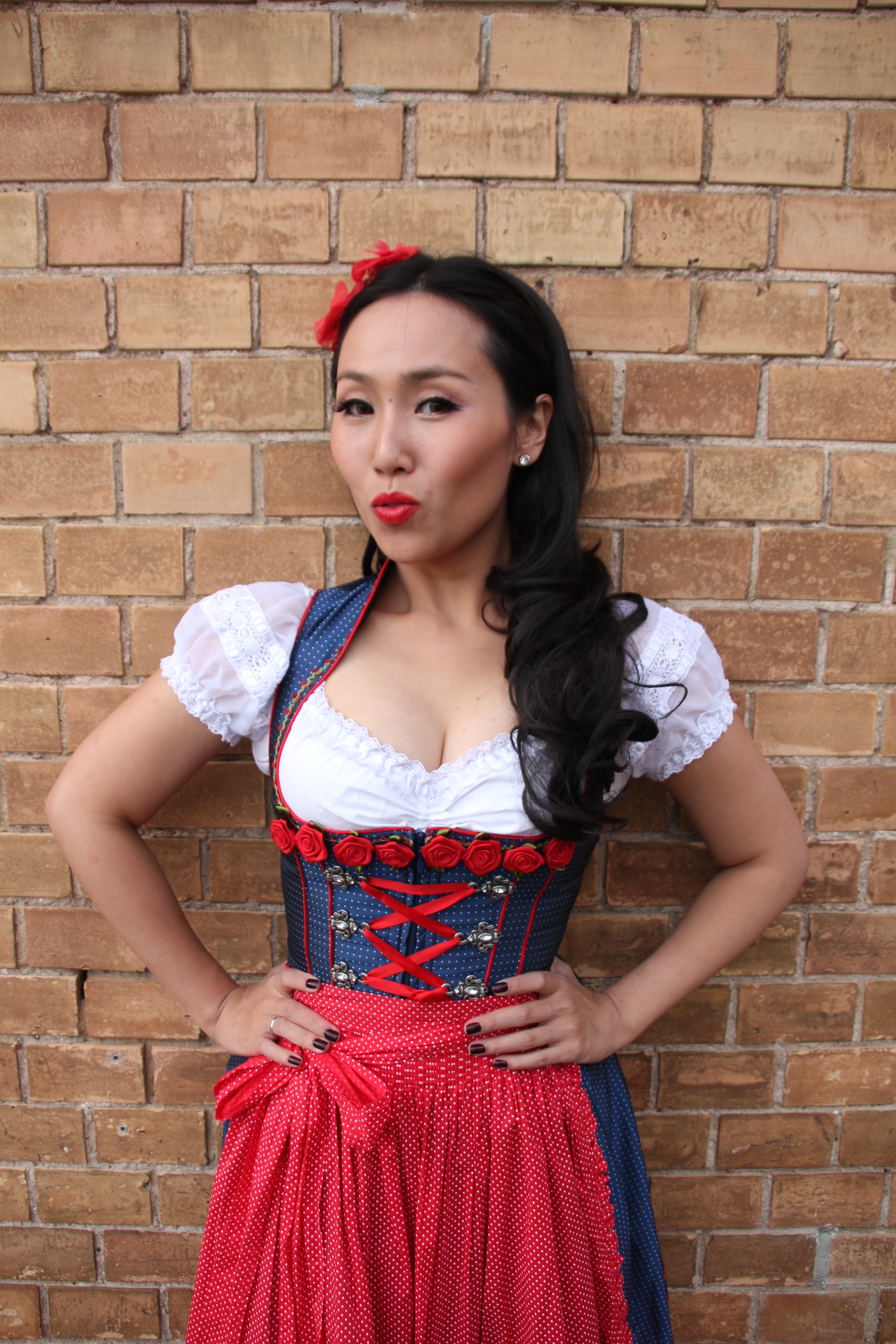 I found my beloved Dirndl dress in a cute Krüger Dirndl shop just 50 meters away from my home in Ludwigsburg, Germany. I’ve never thought passing by the shop window could give me an immediate shot of creative impulse. Of course to make the whole appearance complete my curled wig from my wig collection wasn’t allowed to miss the photo session.