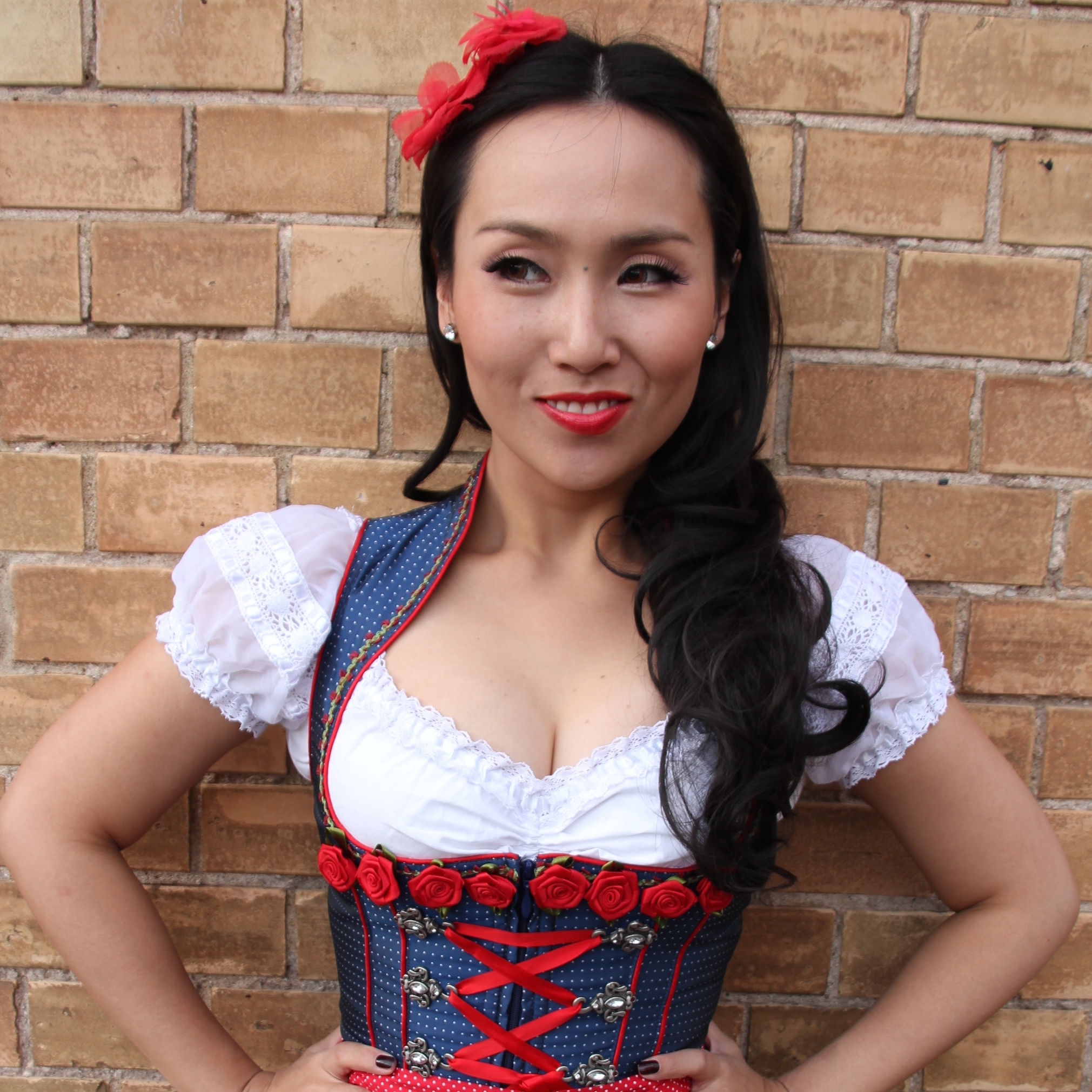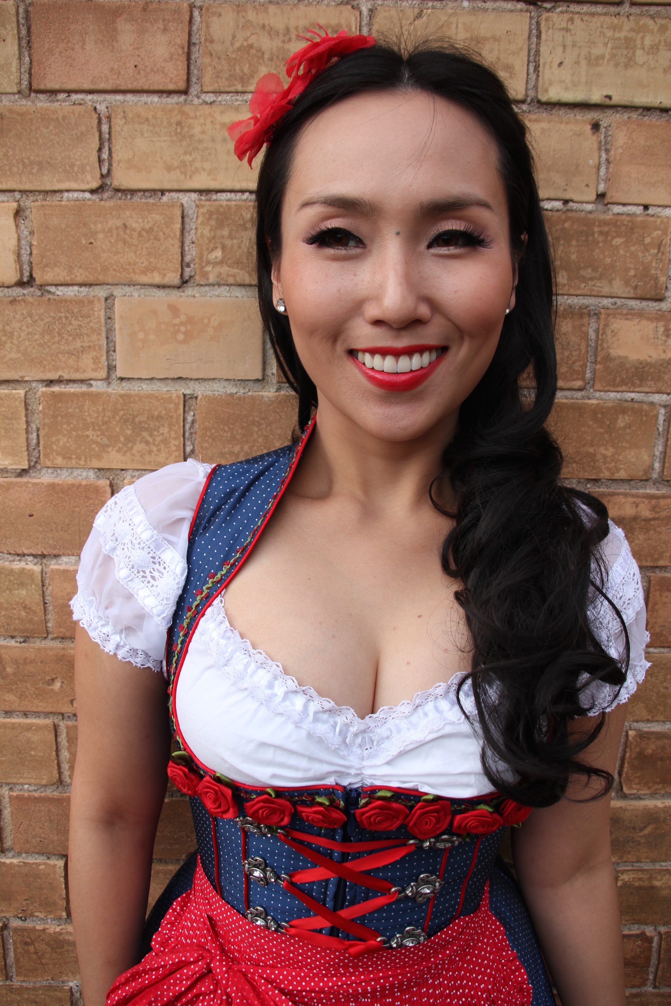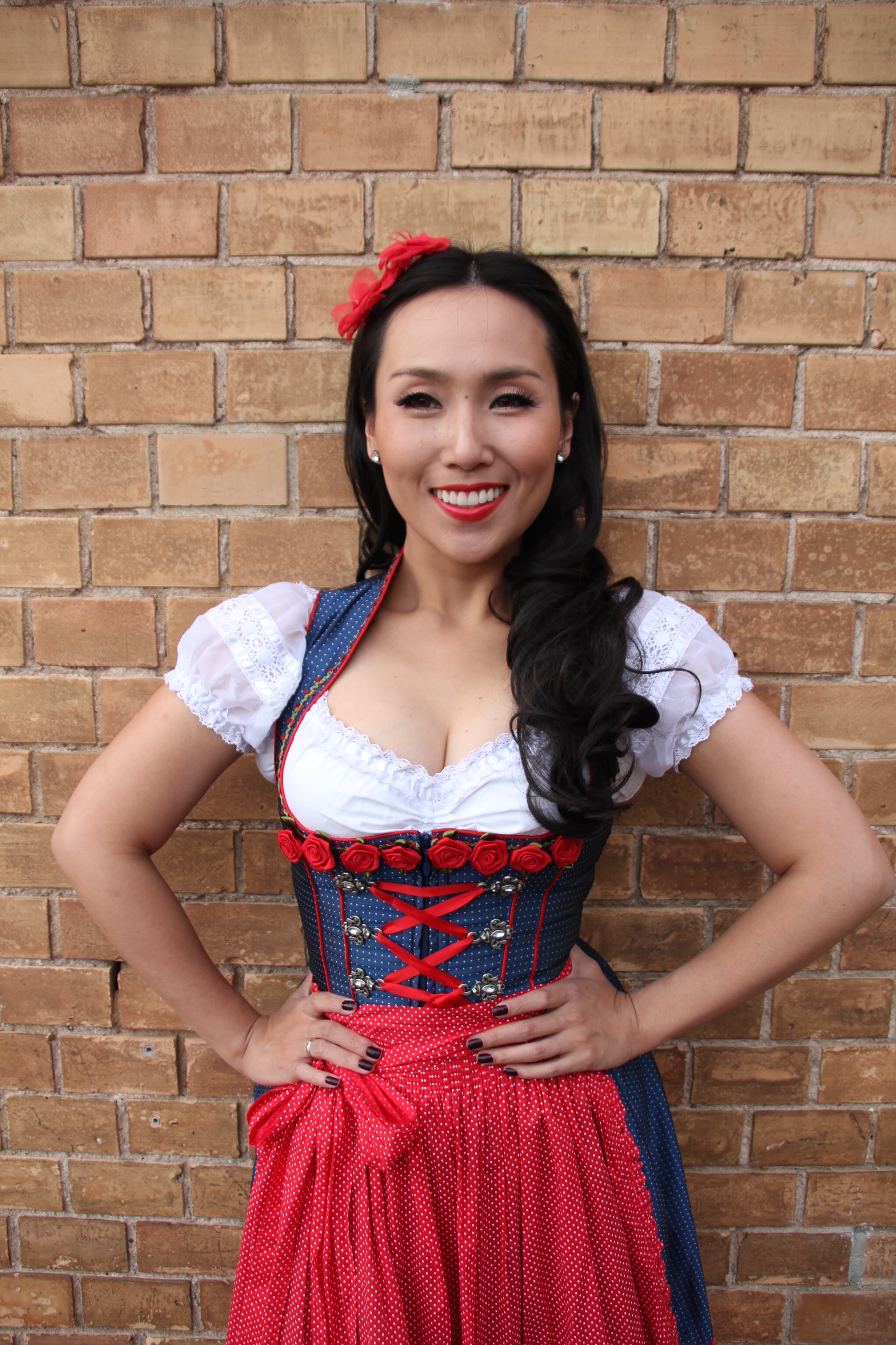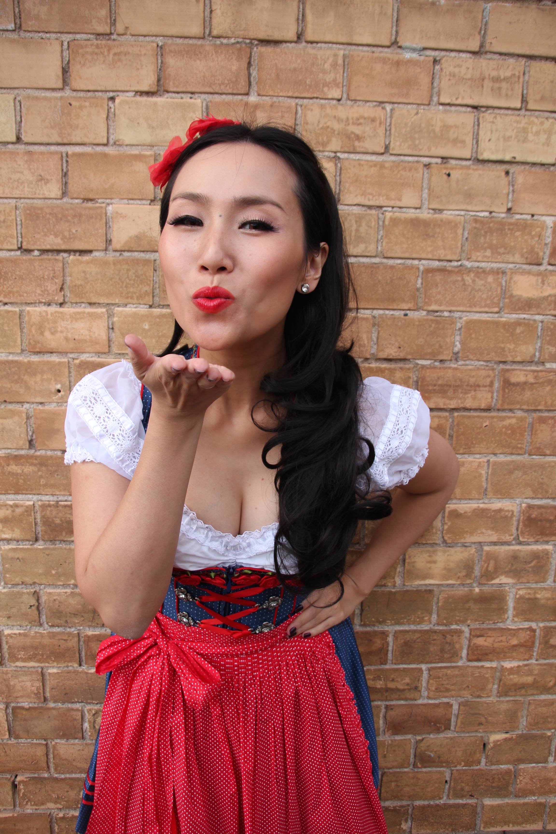 I found my beloved Dirndl dress in a cute Krüger Dirndl shop just 50 meters away from my home in Ludwigsburg, Germany. I’ve never thought passing by the shop window could give me an immediate shot of creative impulse. Of course to make the whole appearance complete my curled wig from my wig collection wasn’t allowed to miss the photo session.