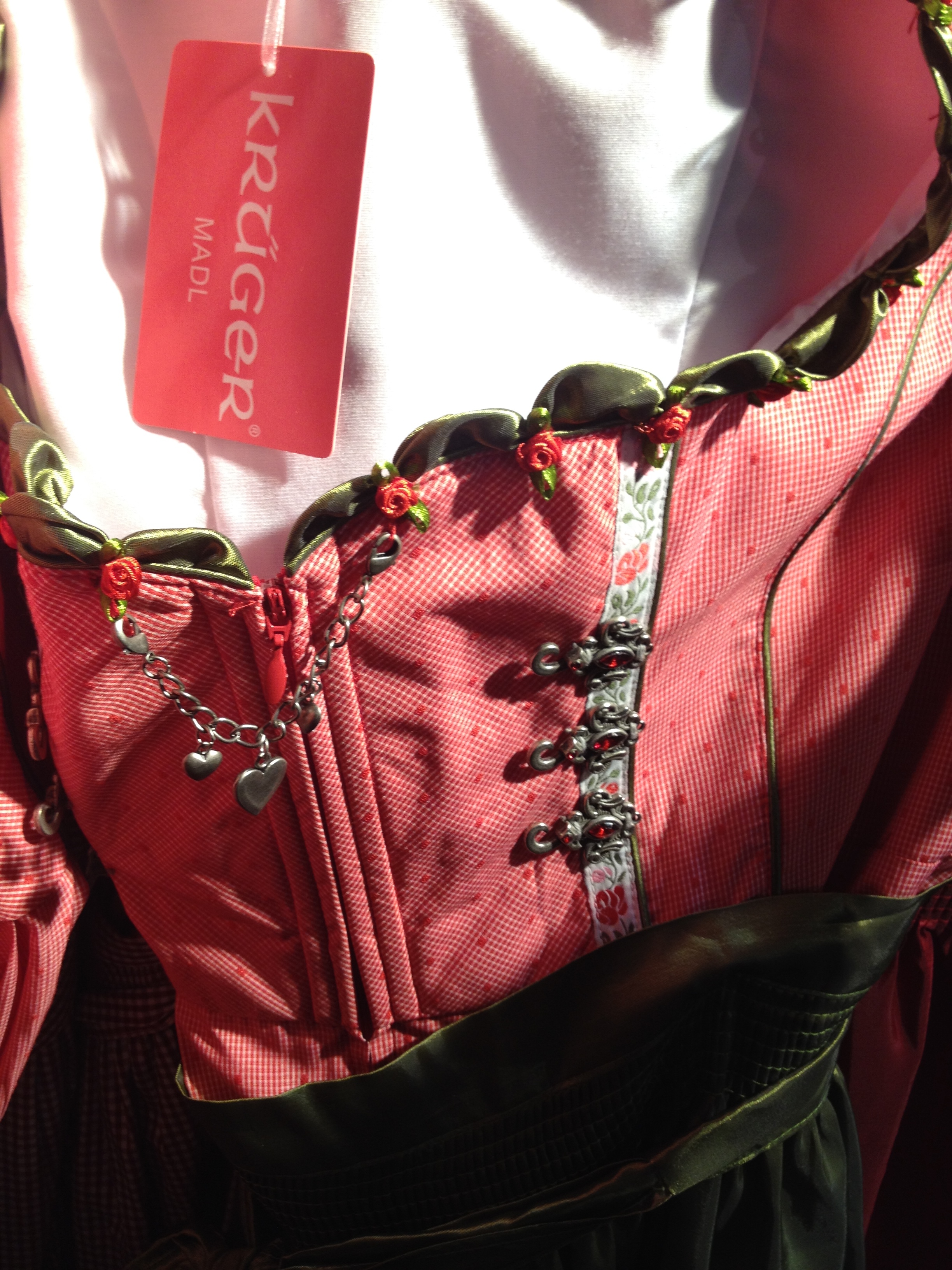 While my last visit at a Krüger Dirndl shop I was surprised by the huge amount of teenaged girls who were delighted by the feeling of shopping in a land of fairy tales. I also found myself in an amazed state while hunting for the right Dirndl dress for me. I fell in love with the art of the handcraft and the high quality of the materials. There are so many little details that have a meaning or story to tell. The symbolic representation of colors and patterns or which side to wear the bow for unmarried and married women. The experience became even more unique while shopping in an environment with cuckoo clock, feathers of pheasant and hunting trophies.